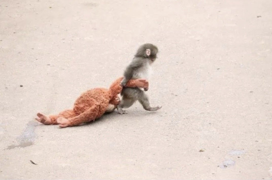 일본에서 오랑우탄 인형을 끌어안고 지내는 새끼 원숭이가 소셜미디어(SNS)에서 화제를 모으고 있다.