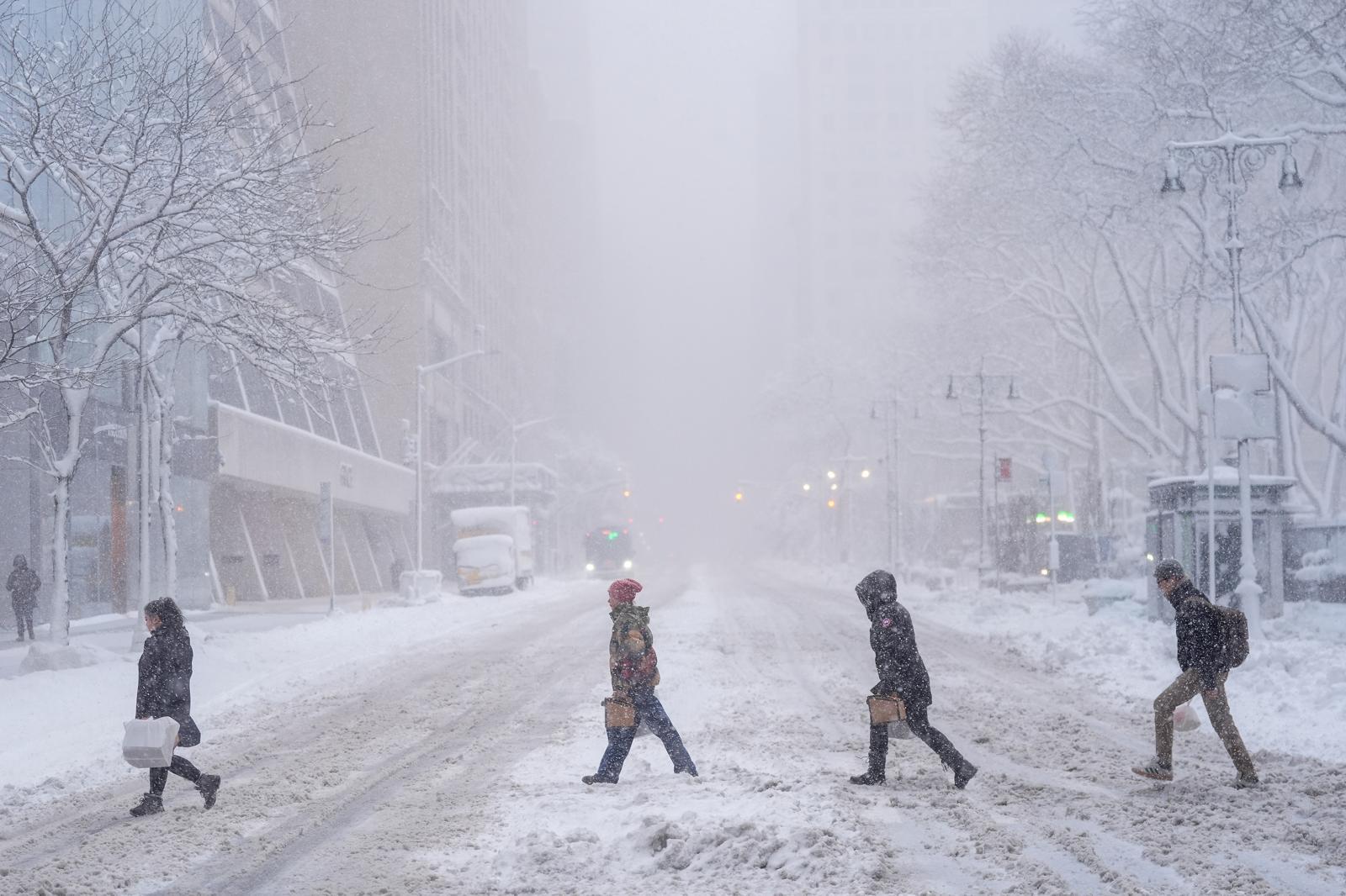 23일(현지 시간) 미국 뉴욕에서 행인들이 눈보라를 뚫고 브라이언트 파크 인근 42번가를 건너고 있다. 뉴욕=AP 뉴시스