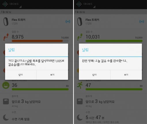 일별 목표에 거의 다다랐을 때 Fitbit 앱을 확인하면, 목표 달성을 격려하는 알림이 나타난다. 목표를 달성했다면 ‘완전 정복! 오늘 걸음 수를 완수했어요’라는 메시지가 온다. 이런 격려를 받다 보니 조금 더 움직이고, 조금 더 걸어야겠다는 생각도 들었다. 참고로 핏비트 플렉스의 기본 목표 설정값은 1만 걸음이지만, Fitbit 메뉴 앱에서 목표 설정값을 변경할 수 있다.
