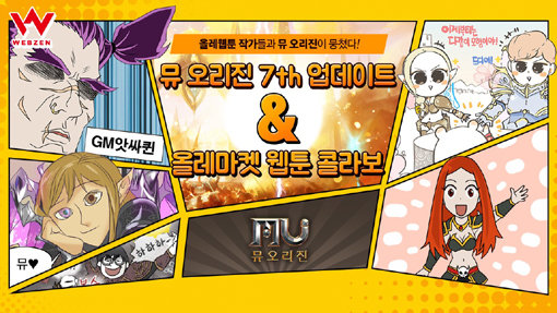 웹젠은 KT와 제휴 협력을 맺고 모바일게임 ‘뮤 오리진’의 지적재산권(IP) 사업 다각화에 나선다. 8월 말까지 KT웹툰에서 ’썸툰’과 ‘개천고’, ‘그녀는 무사다’, ‘악마도 의무교육을 받습니다’ 등 인기 작가가 참여한 총 4편의 브랜드 웹툰을 연재한다. 웹젠은 또 KT웹툰 IP 제휴를 통해 뮤 오리진의 캐릭터 상품 제작과 제휴 영역 확대 등 수익다변화 모델도 추진한다.