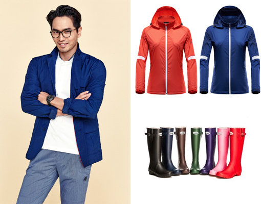 습도가 높은 장마철에는 불쾌지수도 덩달아 올라간다. 장마철을 쾌적하게 보내기 위해서는 방수·발수 기능이 뛰어난 제품들이 필요하다. 루버재킷을 입은 블랙야크 모델 이진욱과 기능성 재킷 및 레인부츠 제품들(작은 사진). 사진제공|블랙야크·형지에스콰이아