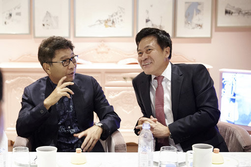 17일 서울 삼성동 SM엔터테인먼트 본사에서 열린 전략적 파트너십 체결 전 대화를 나누는 이수만 SM엔터테인먼트 총괄 프로듀서(왼쪽)과 박정호 SK텔레콤 사장. 사진제공|SM엔터테인먼트