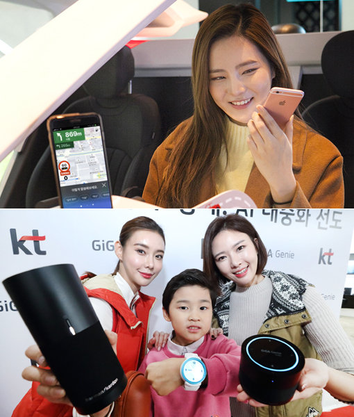 인공지능 기기가 휴대용 스피커와 모바일 내비게이션 등으로 확장되며 춘추전국시대를 맞고 있다. 사진은 SK텔레콤 모바일 내비게이션 ‘T맵 누구’(위쪽)와 KT ‘기가지니 패밀리’. 사진제공|SK텔레콤·KT