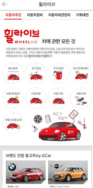 위메프는 모바일에 자동차 등 탈 것의 정보를 담은 ‘휠라이브’를 추가하고, 파트너사와 수입 브랜드 인증 중고차부터 차량 정비 등 맞춤형 정보를 제공한다고 5일 밝혔다. 먼저 도이치모터스 자회사인 ‘지카’와 제휴를 통해 수입 브랜드 인증 중고차를 연동해 보여준다. BMW와 MINI, 벤츠, 아우디, 재규어, 랜드로버, 포르쉐, 포드, 링컨 등 9개 프리미엄 수입 브랜드 차종이 소개된다. 또 독일 차량 외관관리 전문업체 ‘SONAX’와 연계해 수입 브랜드 차량의 효율적 관리 방법을 소개하고, 엔진오일 교체, 타이어 교체·수리 및 렌탈 등 자동차 정비 관련 특가상품도 소개한다.