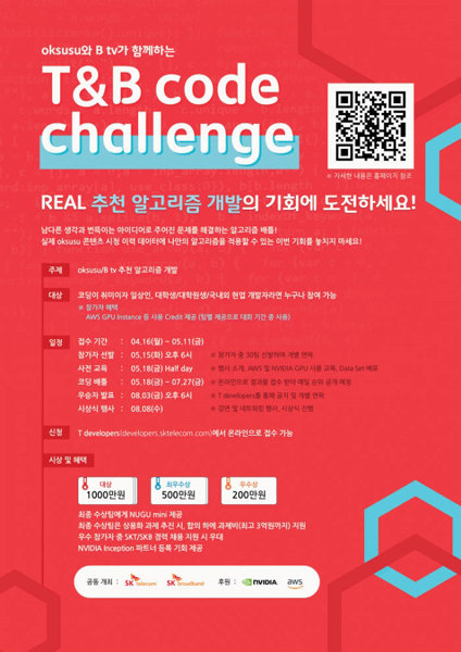 SK텔레콤과 SK브로드밴드는 영화나 주문형비디오(VOD) 등 미디어 콘텐츠를 이용자 취향에 맞게 추천하는 인공지능(AI) 알고리즘 경진대회 ‘T&B코드 챌린지’를 개최한다. 신청 기간은 16일부터 5월11일까지다. AI 전문가라면 누구나 참가할 수 있다.