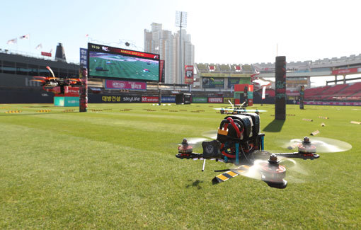 KT는 21일 경기도 수원 KT위즈파크에서 세계최초로 LTE 모듈이 탑재된 레이싱 드론을 시연했다.
