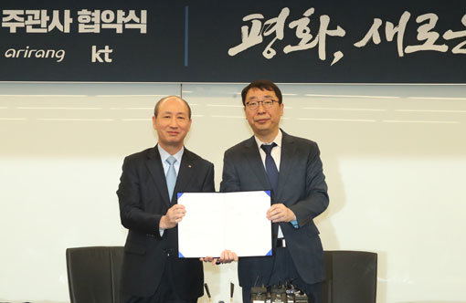 KT 네트워크부문장 오성목 사장(왼쪽)과 대통령비서실 윤영찬 국민소통수석비서관. 사진제공|KT
