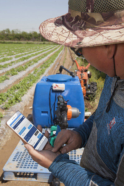 이는 SK텔레콤과 스마프가 함께 개발한 노지재배용 스마트팜 기술로, 사물인터넷(IoT) 플랫폼을 활용해 온도·습도·강수량 등 작물 재배에 필요한 정보들을 실시간으로 분석하고 필요한 물과 양분을 자동 산출해 효율적으로 관리할 수 있도록 해준다. 모바일 기기를 활용한 원격제어도 가능하다.