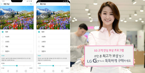 LG전자가 5월3일 공개하는 새로운 전략폰 ‘G7’이 위기의 스마트폰 사업을 구해낼 수 있을지 관심을 모은다. G7의 고화질 디스플레이(왼쪽)와 중고폰 보상 프로그램. 사진제공|LG전자