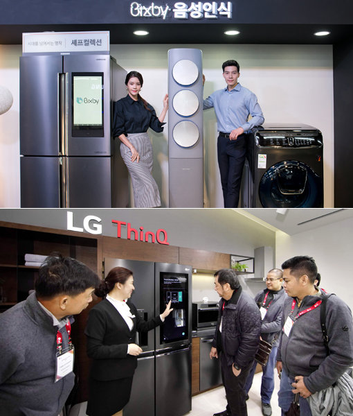 가전 제조 대기업들이 인공지능(AI) 연구개발 경쟁에 나섰다. 사진은 삼성전자 AI 서비스 ‘빅스비’를 적용한 가전제품을 소개하는 모델들(위쪽)과 LG전자 AI 브랜드 ‘씽큐’를 적용한 제품을 살펴보고 있는 해외 바이어들. 사진제공|삼성전자·LG전자