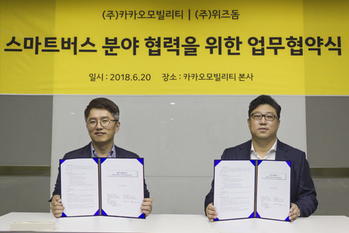 카카오모빌리티는 20일 위즈돔과 ‘스마트버스 전략 파트너십’ 을 체결했다. 버스공유 플랫폼 ‘e버스’를 론칭한 위즈돔은 현재 기업 통근버스와 전세버스, 공항 리무진 등의 교통서비스를 제공하고 있다. 평창동계올림픽 당시 서울과 평창·강릉 올림픽경기장을 오가는 셔틀버스를 운행한 바 있다. 카카오모빌리티는 빅데이터와 인공지능(AI) 기술을 기반으로 스마트버스의 노선 설계, 연계 서비스 개발, 서비스 확대를 위한 홍보마케팅을 지원할 예정이다.