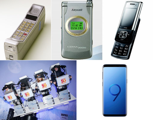 88 올림픽을 앞둔 1988년 7월1일 국내 첫 휴대전화 서비스를 시작한 지 30년이 흘렀다. 휴대전화는 이제 일상생활에서 없어선 안 될 필수품목이 됐다. 1988년 아날로그 방식으로 처음 개통된 일명 ‘벽돌폰’, 1996년과 2003년 서비스를 시작한 2·3세대 이동통신 기반 휴대전화, 2018년 출시된 최신 프리미엄 스마트폰, 내년 3월 상용화 예정인 5G(맨 왼쪽 상단부터 시계 방향으로).