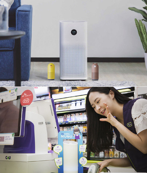 샤오미 스마트홈 기기를 조작할 수 있는 네이버 인공지능 플랫폼 ‘클로바’(위쪽)와 편의점 CU에 배치돼 매장 근무자를 돕는 SK텔레콤 인공지능 서비스 ‘누구’. 인공지능 서비스를 내놓은 국내 업체들이 다양한 분야와 제휴를 통해 서비스 영역 확장에 힘쓰고 있다. 사진제공|네이버·SK텔레콤