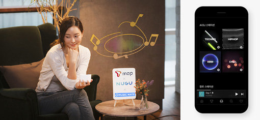 국내 주요 IT기업들이 인공지능 등 차세대 먹을거리의 사용자를 확보하고 충성도를 높이기 위해 음원 서비스 경쟁에 나섰다. SK텔레콤이 ‘누구’에 새롭게 추가한 음악스트리밍 서비스 ‘뮤직메이트’(왼쪽)와 네이버가 AI기술을 접목해 선보인 새 음원 서비스 ‘바이브’. 사진제공|SK텔레콤·네이버