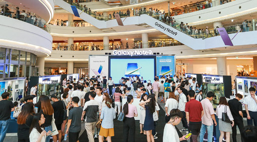삼성전자가 사전예약과 체험존 구축 등 ‘갤럭시노트9’ 마케팅에 나섰다. 사진은 12일 갤럭시 스튜디오를 오픈한 서울 영등포 타임스퀘어 아트리움 광장 모습. 사진제공|삼성전자