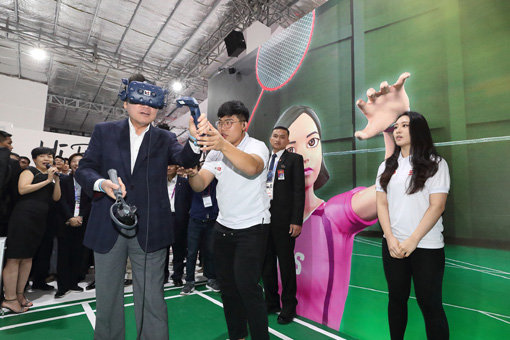 이낙연 국무총리가 19일 인도네시아 자카르타에 문을 연 KT 5G 체험관을 방문해 가상현실(VR) 배드민턴을 체험하고 있다. KT는 9월2일까지 인도네시아 자카르타 경기장에 평창에서 선보였던 5G 서비스를 적용하는 한편 프리뷰와 옴니뷰, 싱크뷰 등을 관람객들이 직접 체험할 수 있는 5G 체험관을 운영한다.