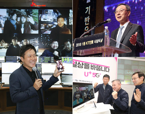 12월1일 첫 전파를 쏘면서 5G 시대를 활짝 연 이동통신기업들이 최근 잇달아 조직개편을 단행하며 5G 경쟁체제를 구축했다. 왼쪽부터 시계 방향으로 5G 서비스를 강조한 박정호 SK텔레콤 사장, 황창규 KT 회장, 하현회 LG유플러스 부회장. 사진제공|SK텔레콤·KT·LG유플러스