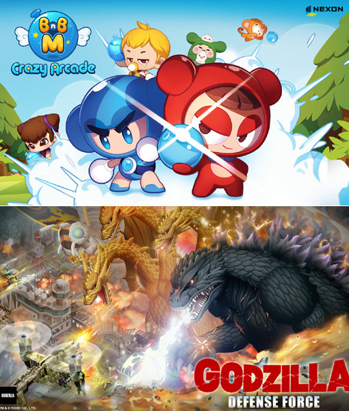 넥슨이 상반기 다수의 신작 모바일게임을 연이어 선보이며 시장 공략을 강화한다. 21일 출시하는 ‘크레이지아케이드 BnB M’(위쪽)과 5월 서비스하는 ‘고질라 디펜스 포스’ 대표 이미지. 사진제공|넥슨