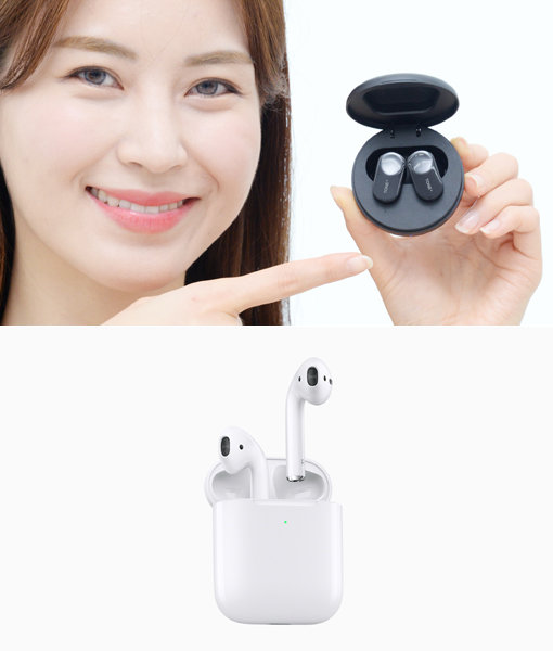 LG전자의 ‘LG 톤플러스 프리’(위쪽)와 애플의 ‘에어팟’. LG전자가 무선 이어폰 시장에 진출하면서 기존 양강인 삼성전자·애플과의 치열한 경쟁이 예상된다. 사진제공|LG전자·애플