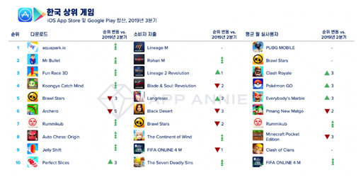 모바일 데이터 분석 플랫폼 앱애니는 3분기 앱스토어와 구글플레이 합산 국내 모바일게임 시장을 분석한 결과 다운로드 수는 1억4370만 건, 소비자 지출액은 10억 달러(약 1조1743억 원)로 나타났다고 24일 밝혔다. 하루에 159만6000 건 이상 다운받고, 약 130억 원 이상을 소비한 셈이다. 소비자 지출 부문 1위는 엔씨소프트의 ‘리니지M’이 차지했고, 플레이위드의 ‘로한M’, 넷마블의 ‘리니지2 레볼루션’이 뒤를 이었다. 10위권 중 절반은 다중접속역할수행게임(MMORPG)으로 나타났다.