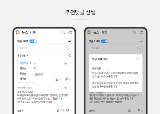 카카오는 포털 다음과 카카오톡 #탭의 뉴스 댓글 서비스에 이용자들이 댓글에 남긴 피드백을 바탕으로 임의 순서대로 보여주는 ‘추천댓글’ 정렬을 신설했다. 뉴스에 댓글과 피드백(찬성·반대)이 발생했을 경우, 전체 댓글 중 일정 수 이상의 찬성을 받은 댓글을 임의 순서로 보여주는 방식이다. 일정 개수 이상의 댓글이 발생한 뉴스에서는 추천댓글을 기본 정렬 방식으로 제공한다. 기본 정렬 방식에 비해 이용자들이 더 다양한 댓글을 발견하고 소통할 수 있는 기회를 늘리기 위한 것이란 게 카카오 측 설명이다. 기존의 기본 정렬 방식이던 ‘추천순’ 정렬은 댓글 찬성수에서 반대수를 뺀 수치를 기준으로 한다는 의미를 더 명확하게 하기 위해 ‘찬반순’ 으로 명칭을 변경한다. 댓글 개수가 많지 않은 뉴스에서는 찬반순, 최신순, 과거순 댓글 목록만을 제공한다.