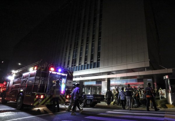 15일 화재가 발생한 경기도 성남 SK C&C 판교 데이터센터 앞에서 소방관들이 분주하게 움직이고 있다. 이날 화재로 ‘카카오톡’을 비롯한 카카오의 주요 서비스가 제대로 이뤄지지 않아 소비자들이 큰 불편을 겪었다. 사진 | 뉴시스