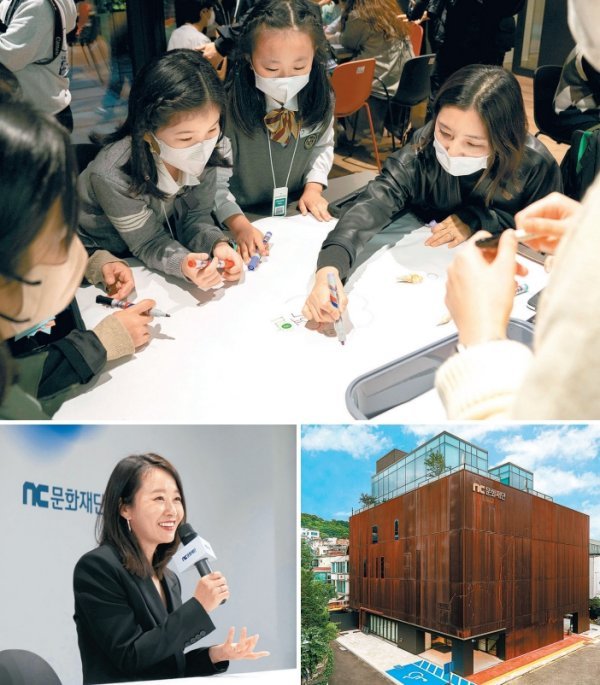 열린 NC문화재단 전경, ‘프로젝토리’를 설명하고 있는 윤송이 NC문화재단 이사장.(위부터 시계방향) 사진제공|NC문화재단