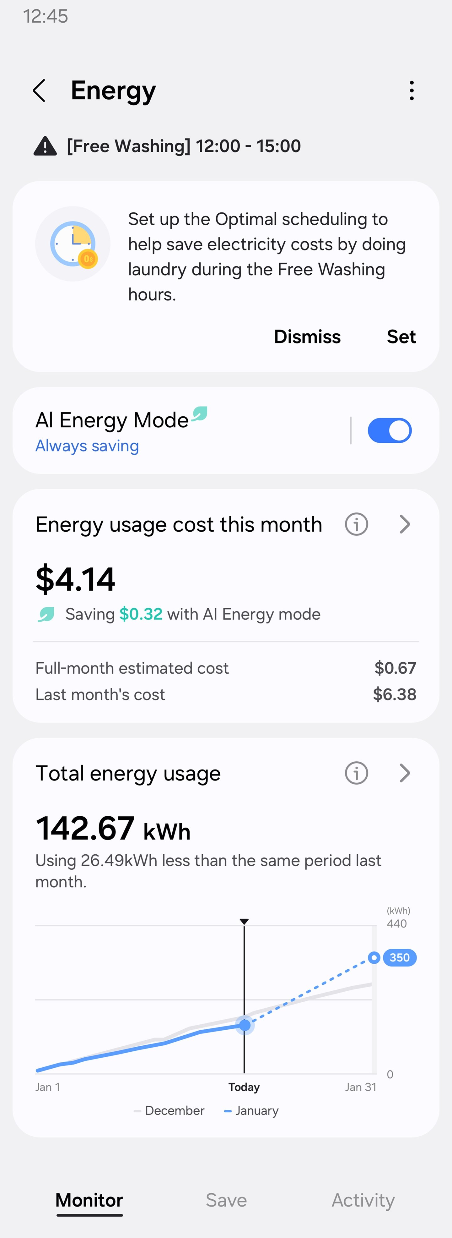 사용자들은 ‘스마트싱스’ 앱의 ‘에너지’ 기능을 통해 전기요금 할인 혜택을 받을 수 있다. 전기요금 혜택이 제공되는 시간에 맞춰 알림을 받을 수 있고 연결된 집안 가전들의 사용량과 전기요금을 한눈에 모니터링할 수 있다.