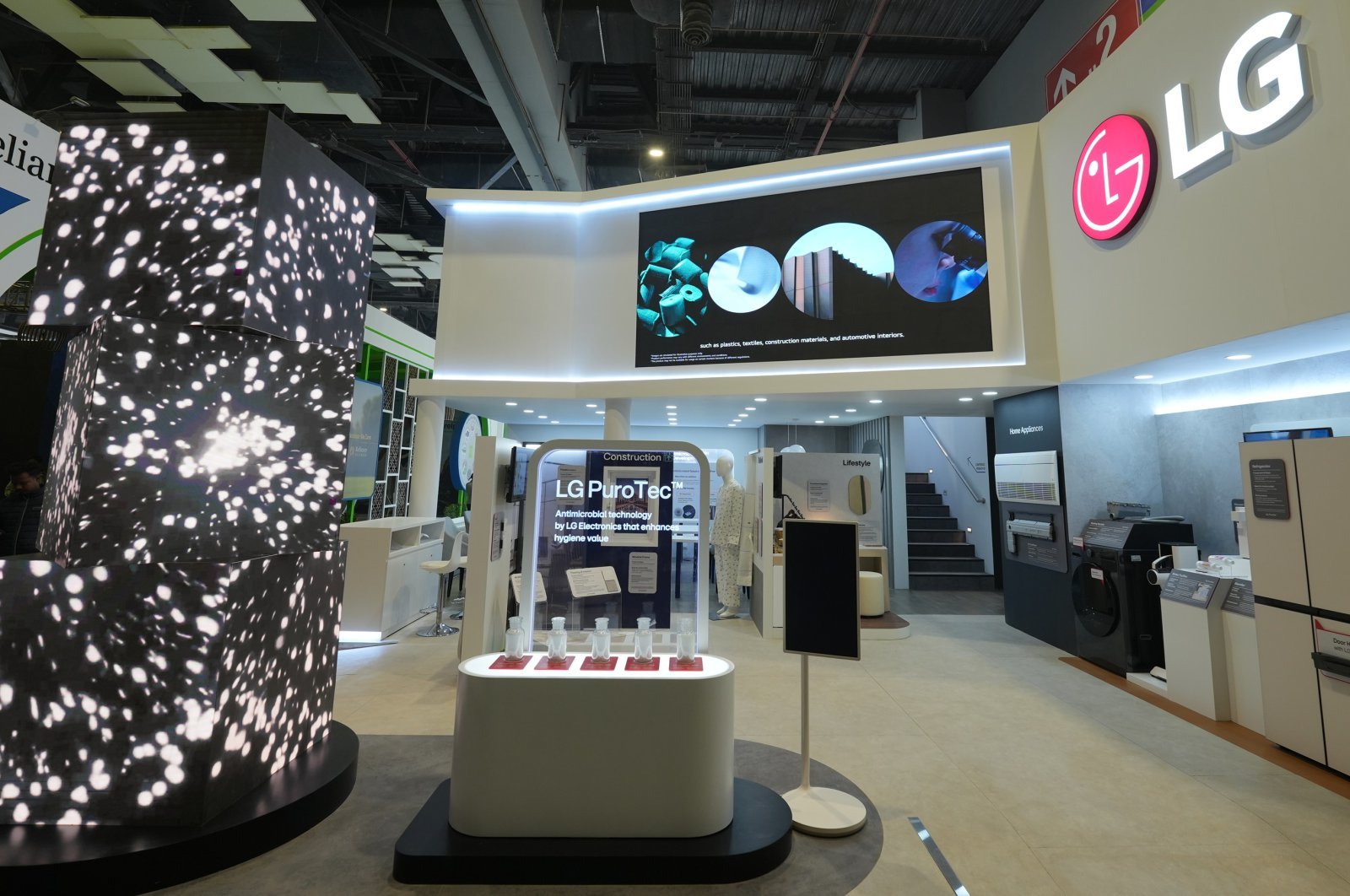 유리 파우더 형태인 ‘퓨로텍’은 플라스틱이나 페인트, 고무 등 자재를 만들 때 소량 첨가하면 미생물에 의한 악취, 오염 등을 막는 항균·항곰팡이 기능성 소재다. LG전자는 전시관 전면에 총 5개의 ‘퓨로텍’ 라인업을 내세우고, 이를 적용한 다양한 제품들을 체험할 수 있도록 부스를 조성했다. 가전을 비롯해 건축자재, 위생용품, 식품포장, 의료장비 등 생활 밀착형 제품군에 ‘퓨로텍’이 적용된 사례를 소개했다.