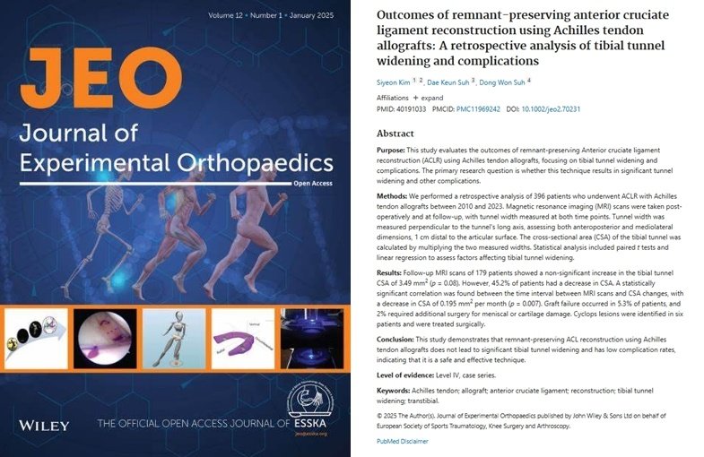 보건복지부 지정 관절 전문병원인 바른세상병원 관절센터의 서동원 원장(정형외과/재활의학과 전문의)이 전방십자인대재건설 관련 논문을 국제학술지 JEO(Journal of Experimental Orthopaedics)에 발표했다.