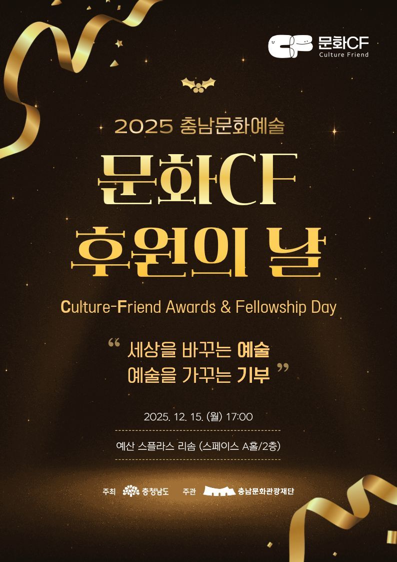 충남문화관광재단(대표이사 이기진)이 12월 15일 예산 스플라스 리솜 세미나실에서 ‘문화CF 후원의 날 – 세상을 바꾸는 예술, 예술을 가꾸는 기부’ 행사를 진행한다. 예술과 후원이 지역에 남긴 흔적을 한자리에 모아 소개하는 자리다.