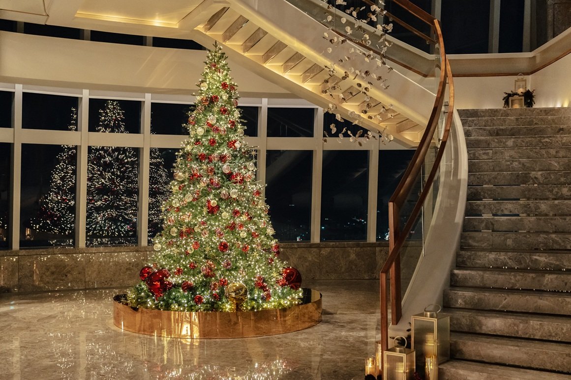 호텔 내부 역시 연말 분위기로 채워졌다. 시그니엘 서울은 79층부터 81층까지 이어지는 나선형 계단 입구에 대형 크리스마스 트리를 설치했다. 레드, 골드, 실버 컬러 오너먼트와 크리스탈, 금빛 장식이 조화를 이루며 공간 전체에 시즌 무드를 더한다. 낮에는 통유리창 너머로 서울 스카이라인이 펼쳐지고, 일몰 이후에는 계단을 따라 배치된 랜턴 조명과 플라워 장식이 시간대에 따라 다른 인상을 만든다.