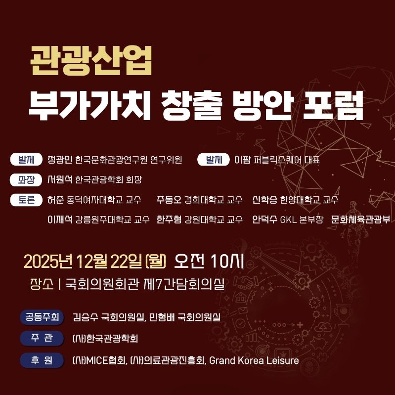 이번 포럼은 국회 문화체육관광위원회 소속 김승수 의원과 민형배 의원이 공동 주최하고, 사단법인 한국관광협회가 주관한다. 관광객 3000만 명 시대를 앞두고 관광산업의 경쟁력을 높이고, 고부가가치 관광 수요 증가에 어떻게 대응할지를 논의하기 위해 마련됐다.