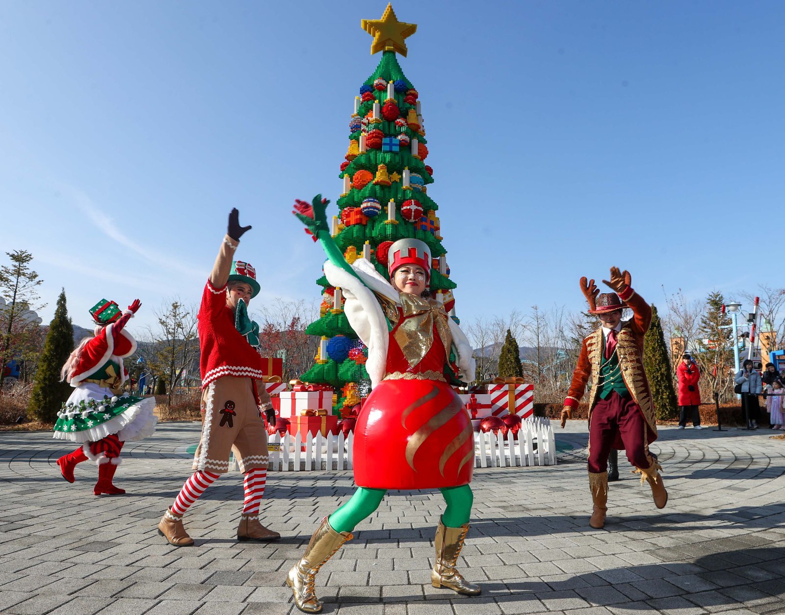 “메리 브릭스마스! 레고랜드 트리 앞에서 모두 만나요!” 춘천 레고랜드에 설치된 초대형듀플로 크리스마스 트리 앞에서 겨울 시즌 브릭스마스 공연이 펼쳐지고 있다. 레고랜드 제공
