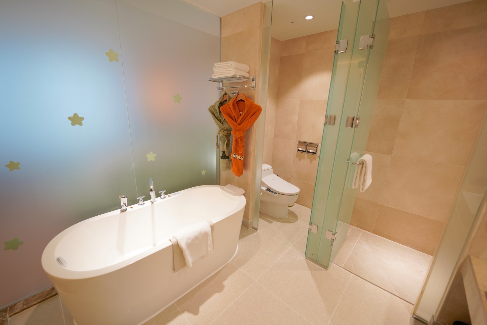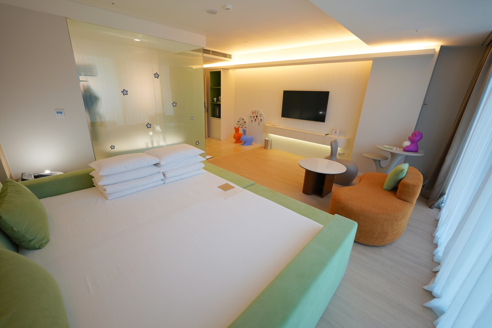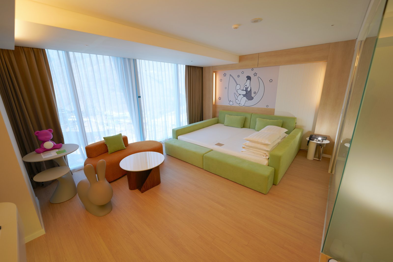 객실에는 유럽 친환경 섬유 인증인 오코텍스 인증을 받은 저상형 패밀리 침대가 설치돼 있다. 최대 4인 가족이 함께 이용할 수 있는 구조로, 아이가 침대에서 떨어질 걱정을 덜 수 있다. 토끼 모양 의자와 곰돌이 무드등도 배치해 객실 분위기를 부드럽게 구성했다.