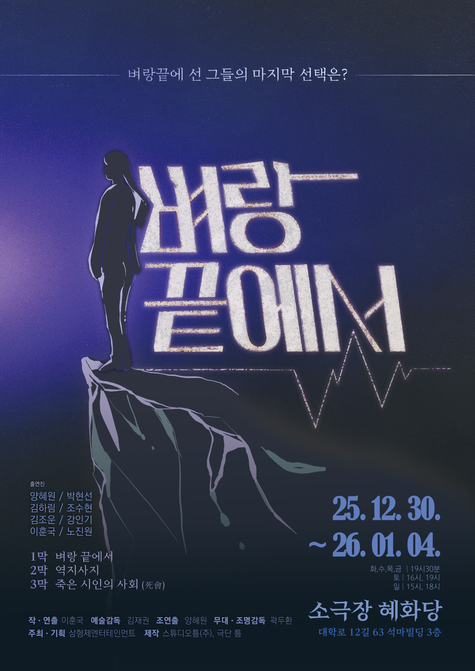 [스포츠동아 | 양형모 기자] 연말이면 웃음과 위로를 앞세운 공연이 대학로를 채우지만, 올해 세밑 무대에는 다른 선택을 한 연극이 자리한다. 삶과 죽음을 정면으로 꺼내 든 연극 ‘벼랑 끝에서’가 12월 30일부터 2026년 1월 4일까지 서울 대학로 소극장 혜화당에서 관객을 만난다.