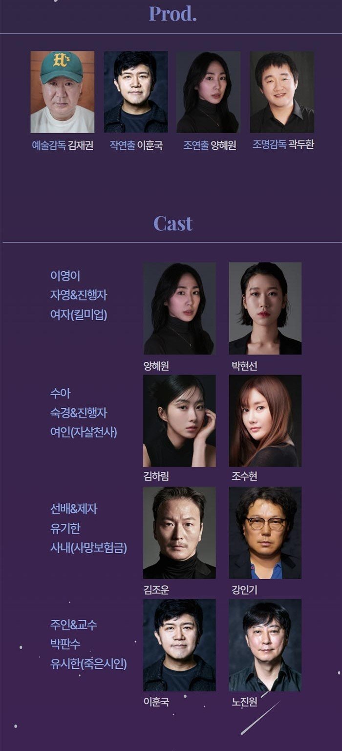 출연 배우 전원은 1인 다역으로 무대에 선다. 양혜원·박현선, 김하림·조수현은 더블 캐스팅으로 각기 다른 색의 절망과 희망을 표현한다. 김조운·강인기는 극의 중심 인물들을 오가며 무대를 이끈다. 작가이자 연출인 이훈국 역시 노진원과 함께 직접 출연해 작품의 메시지를 가장 가까운 거리에서 전달한다.