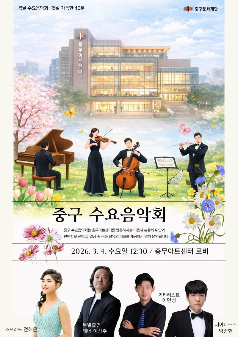 중구문화재단은 앞으로 매월 1주와 3주 수요일마다 수요음악회를 이어간다. 충무아트센터와 스포츠센터를 오가는 전 세대 이용객이 일상 속에서 자연스럽게 공연을 만날 수 있도록 로비 공간을 상설 음악 무대로 운영할 방침이다. 공연은 사전 신청 없이 자유롭게 관람할 수 있다.