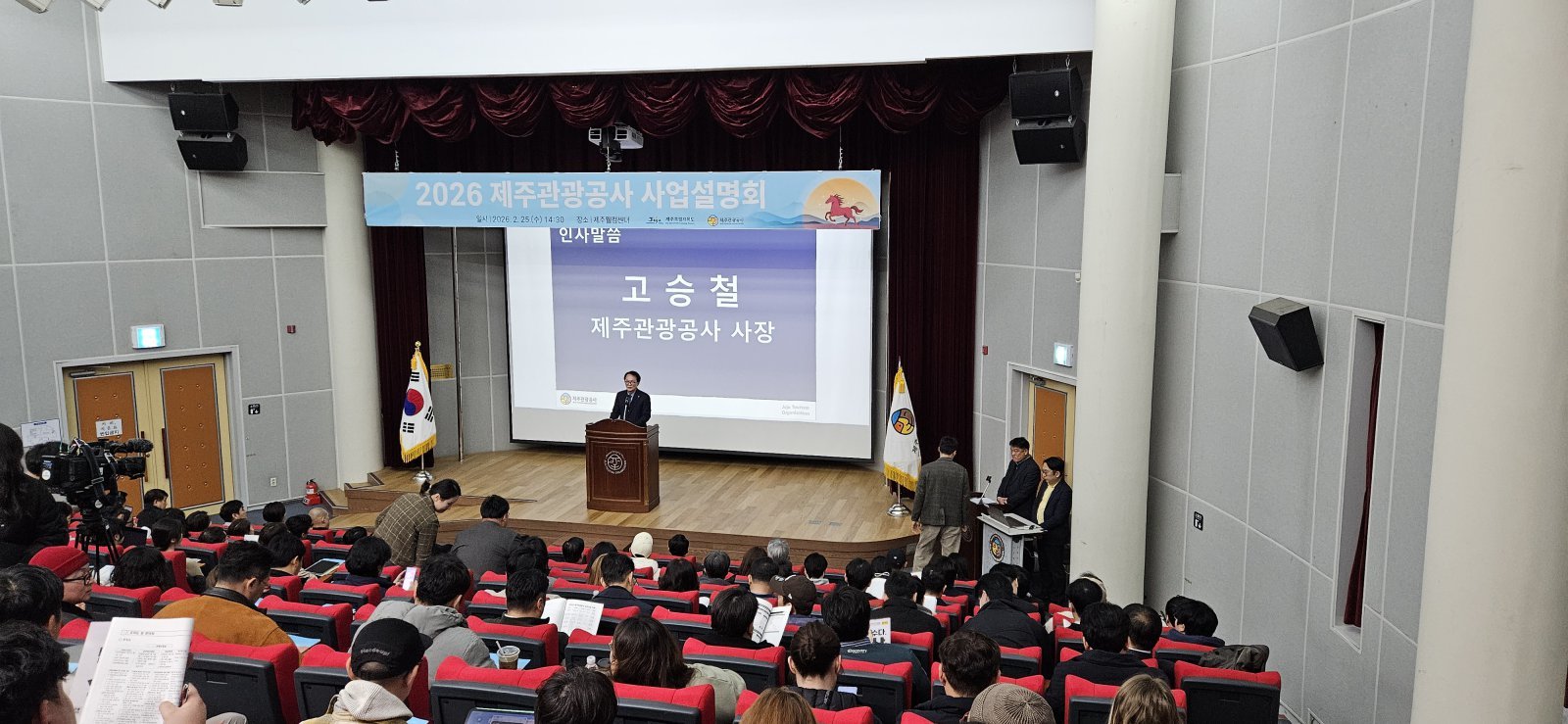 행사는 오후 2시 30분 1부 순서로 시작됐다. 고승철 사장의 인사말에 이어 문재원 제주특별자치도 관광정책과장이 2026년 관광정책 방향을 발표했다. 이후 제주관광공사 관광마케팅실과 관광산업실, 면세사업실이 차례로 올해 사업계획을 소개하고, 협력 사항과 공모사업 내용을 공유했다.