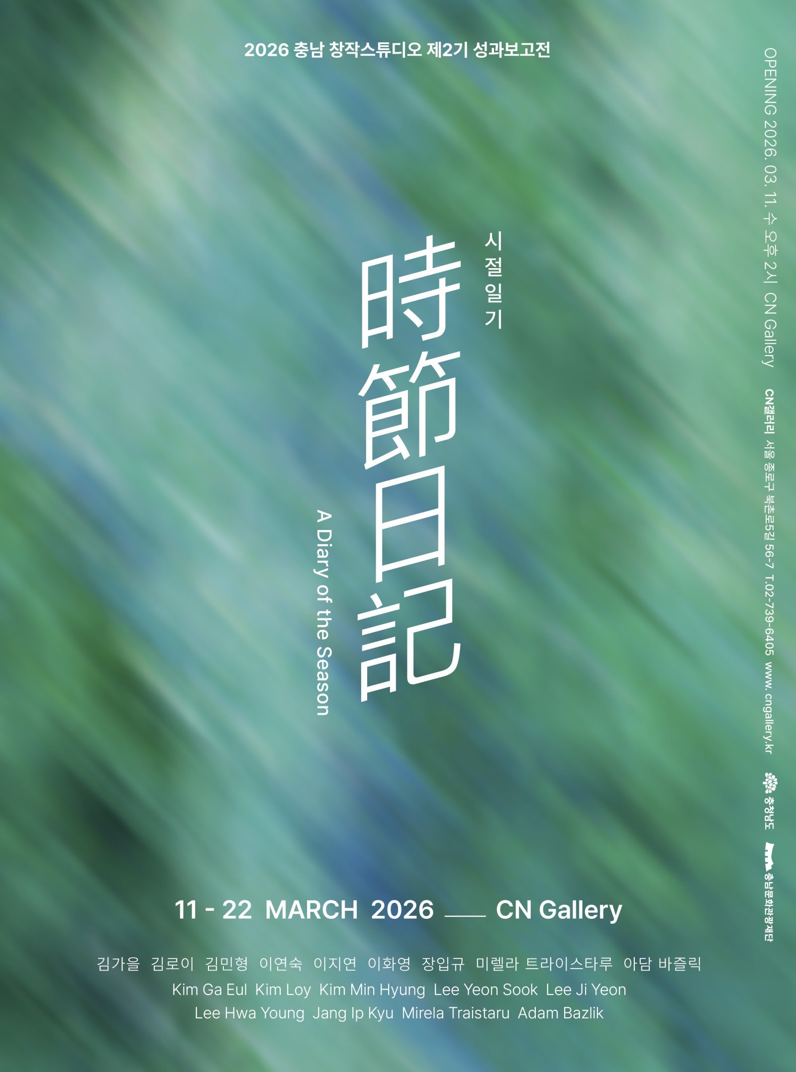 [스포츠동아 양형모 기자] 충청남도와 충남문화관광재단이 주최·주관하는 충남창작스튜디오 2기 입주작가 성과보고전 ‘시절일기時節日記’가 3월 11일부터 22일까지 서울 북촌 CN갤러리에서 열린다. 이번 전시는 스튜디오 입주 기간 동안 이어진 작가들의 창작 결과를 공개하는 자리다.