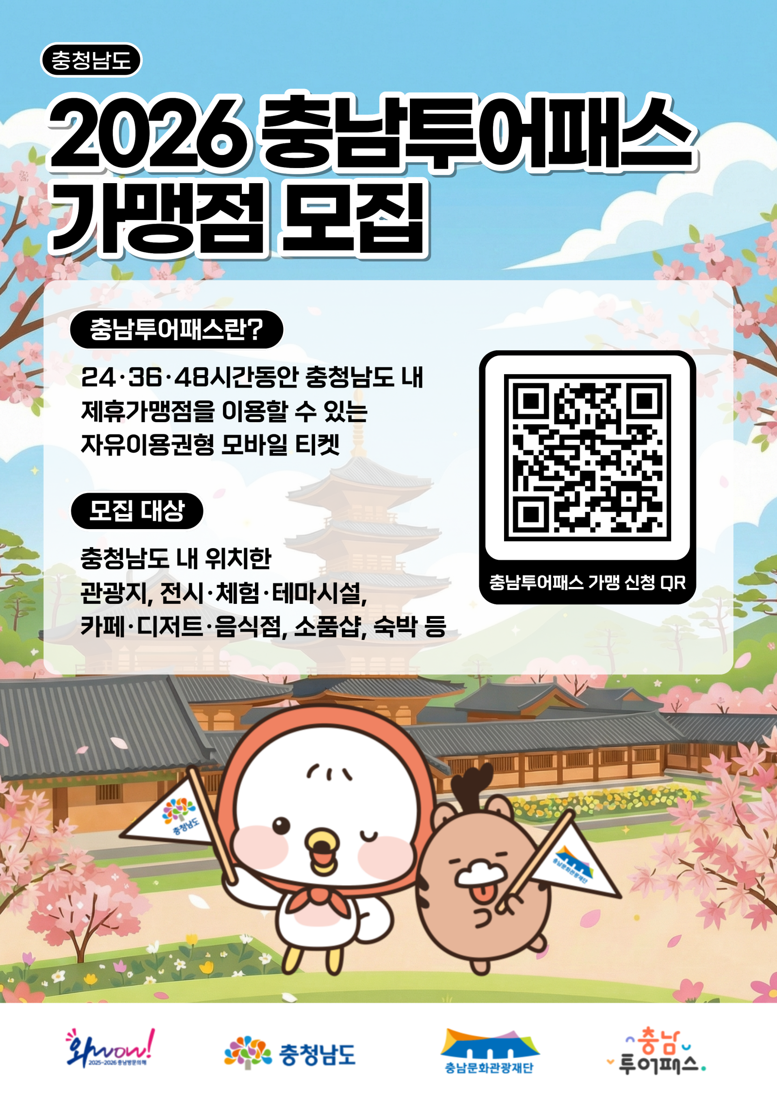 [스포츠동아 양형모 기자] 충청남도와 충남문화관광재단은 도내 관광 활성화와 지역 상권 상생을 위해 ‘2026 충남투어패스’ 신규 가맹점을 모집한다고 밝혔다. 충남투어패스는 일정 시간 동안 충남 주요 관광지와 체험시설, 카페, 음식점 등을 자유롭게 이용하거나 할인 혜택을 받을 수 있는 모바일 관광 자유이용권이다.