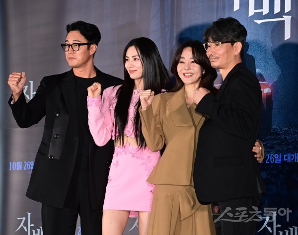 배우 소지섭, 나나, 김윤진, 윤종석 감독이 18일 서울 광진구 자양동 롯데시네마 건대입구점에서 열린 영화 ‘자백’ 언론시사회에서 포즈를 취하고 있다.
