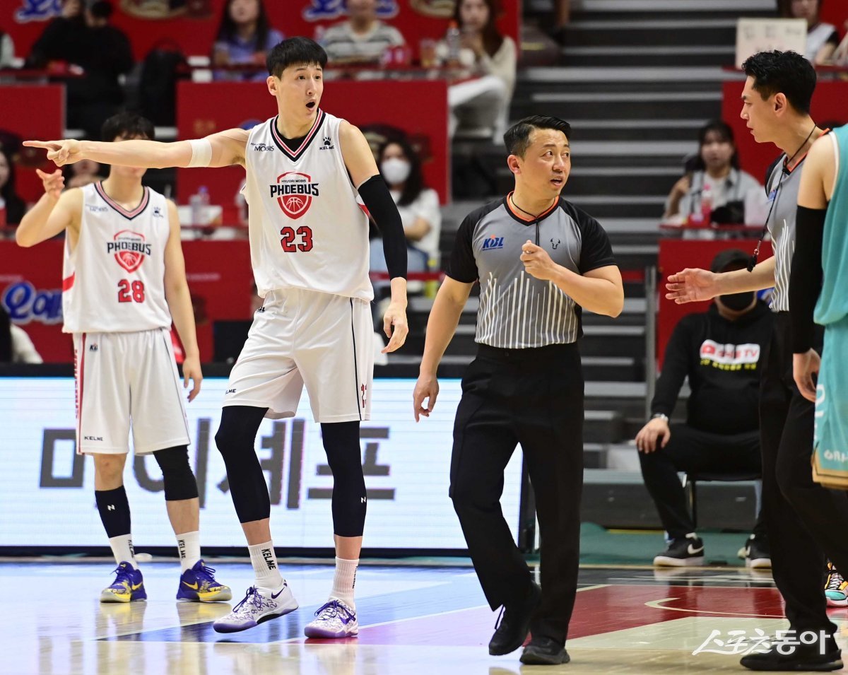 7일 경기도 수원KT소닉붐아레나에서 열린 ‘2023-2024 정관장 프로농구’ 6강 플레이오프 2차전 수원 KT와 울산 현대모비스의 경기에서 현대모비스 최진수가 심판들에게 어필하고 있다.