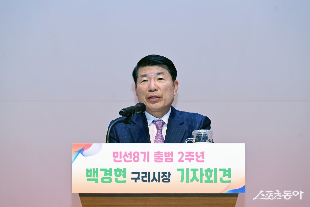 백경현 구리시장이 1일 여성행복센터에서 취임 2주년 기자회견을 하고 있다. 사진제공ㅣ구리시
