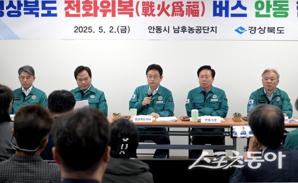 경상북도는 지난 2일 안동 남후농공단지에서 이철우 도지사 주재로 ‘경상북도 전화위복(戰火爲福) 버스’ 현장회의를 개최했다. 이번 회의는 지난 4월 27일 영덕 노물리에 이어 두 번째로 열린 전화위복 회의로, 산불 피해를 입은 지역의 신속한 회복과 재건을 위한 대책 논의의 일환이다.이날 회의에는 경북도청 전 간부 공무원, 권기창 안동시장, 권광택 도의회 행정보건복지위원장, 김대일·김대진 도의원, 안동시 시의원을 비롯해 남후농공단지 내 피해 기업 대표 등 100여 명이 참석했다.