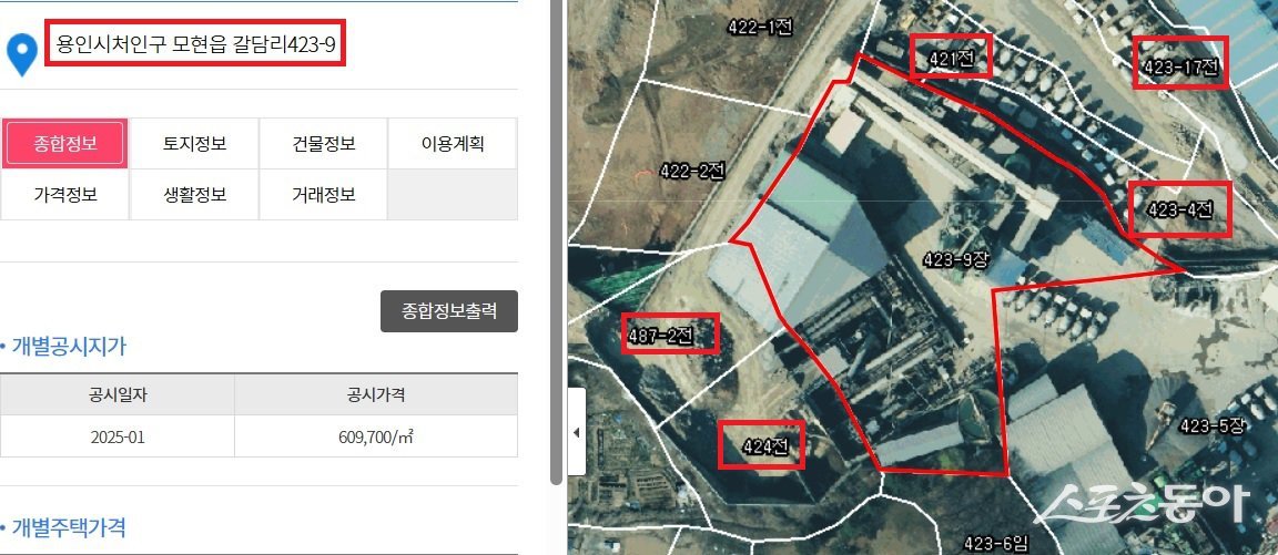 문제가 된 부지는 모현읍 갈담리 487-2번지 외 4필지로, 모두 농지로 등록돼 있다. 그러나 경기도 항측에는 일부 부지는 사실상 주차장 및 자재 야적장으로 활용되고 있는 것으로 나타났다. 특히, 건축물대장상 차량 2대만 주차 가능한 곳에 약 20대 이상이 주차돼 있다는 항공사진 분석 결과도 제기됐다.