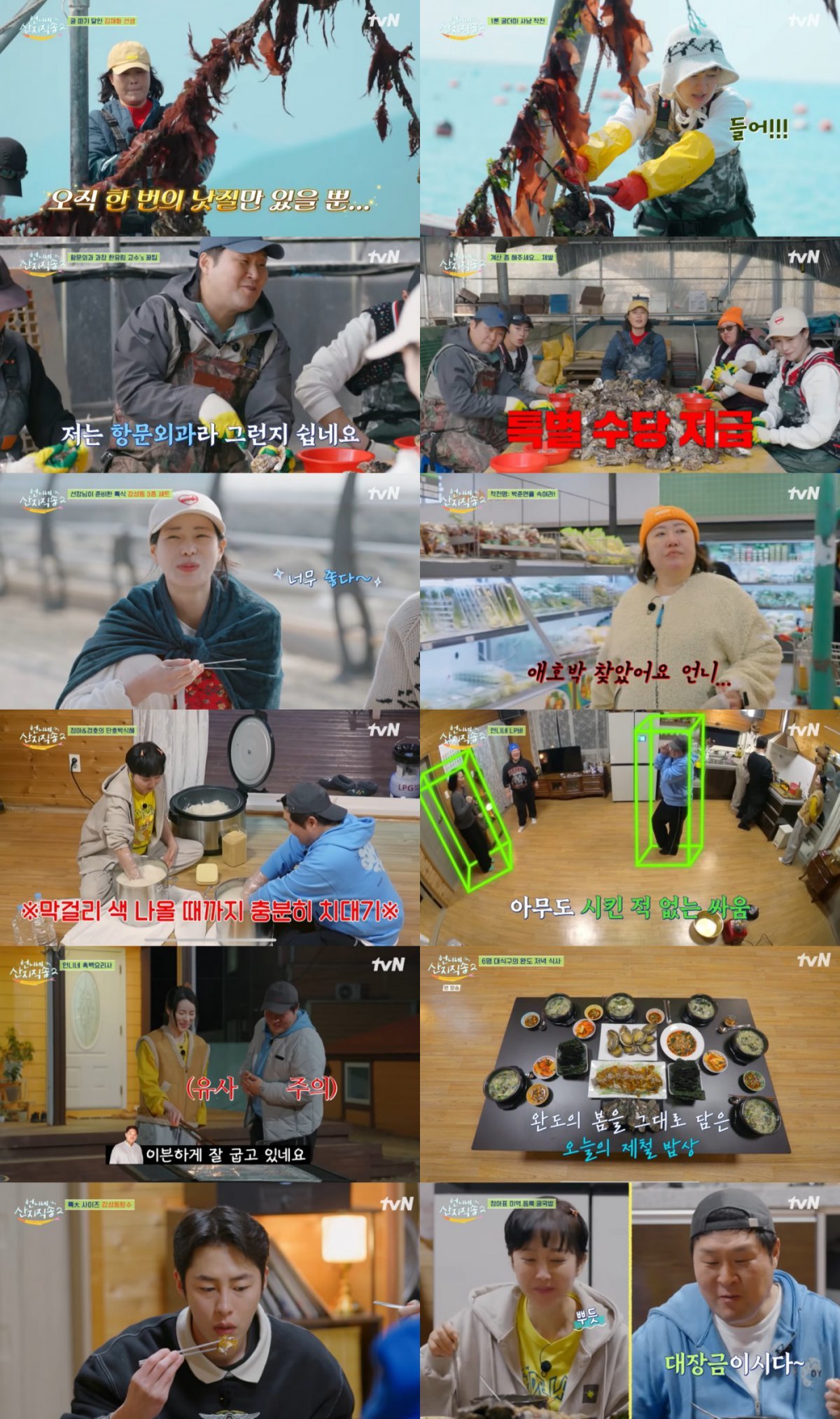 게스트 김재화, 윤경호의 반가운 합류 속 사 남매는 두 배로 나눠 굴 따기 조업에 나섰다. 배당 450kg씩, 도합 900kg의 굴을 따야 하는 노동으로, ‘인간 도르래’가 된 이재욱은 어마어마한 양의 굴 무더기를 끌어 올리며 큰 키 때문에 유독 힘겨워하는 모습을 보였다. 어느덧 뱃일이 익숙해진 염정아는 한 번 보고도 요령을 터득하며 믿고 보는 일꾼의 모습을 보였고, 김재화 역시 예사롭지 않은 낫질 실력과 함께 ‘프로 일잘러’의 면모를 보여 막내들의 감탄을 이끌기도. 김재화는 “우리가 먹는 굴이 이런 과정을 거치다니 감사한 마음으로 먹어야겠다”라며 식재료의 소중함을 되새겼다.