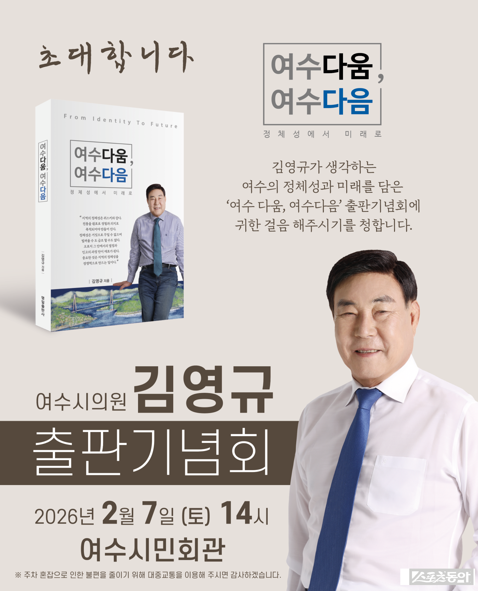 김영규 의원은 초청의 글을 통해 “여수에서 나고 자라 30년 넘게 정치를 하면서 결코 놓지 못했던 화두가 바로 여수의 정체성과 미래였다”며 “결론을 내기보다는 시민 여러분과 함께 생각해 보자는 취지로 책을 엮었다”고 전했다.