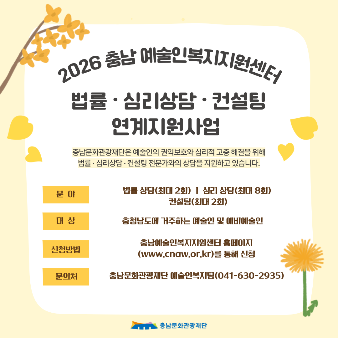 [스포츠동아 양형모 기자] 충남문화관광재단이 지역 예술인의 창작 활동을 돕기 위해 법률과 심리, 컨설팅을 아우르는 맞춤형 상담 지원을 시작한다.