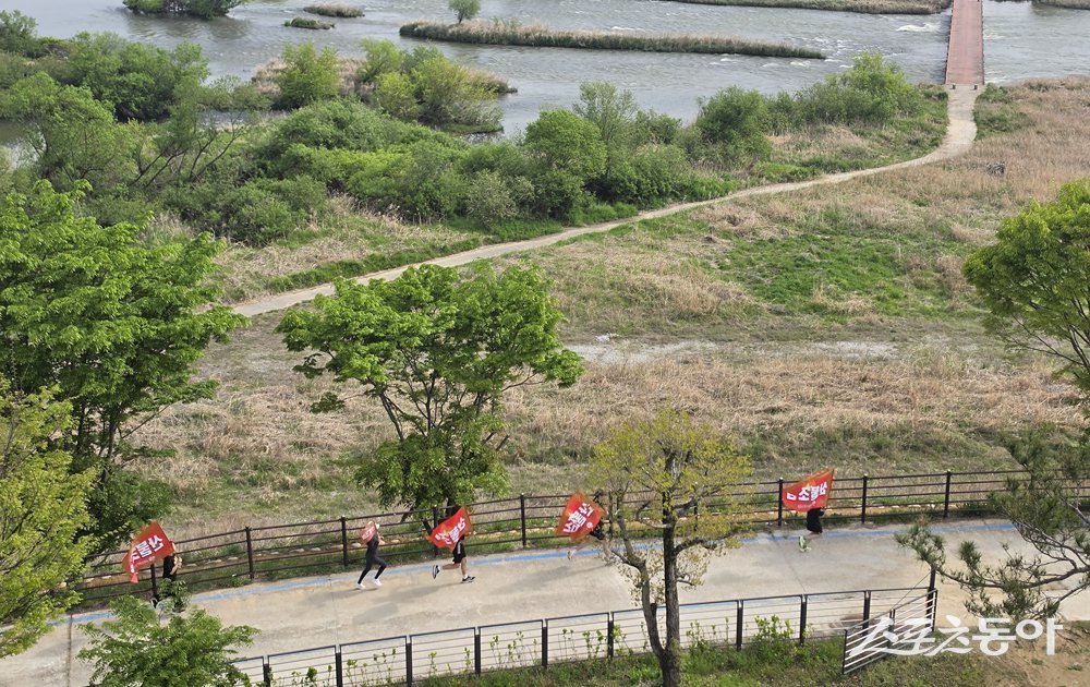 뜻을 함께한 직원들은 산불 예방 문구가 적힌 깃발을 들고 강변을 달리며 마주치는 관광객과 지역 주민들에게 전단지를 직접 건네 예방 수칙을 안내했다.